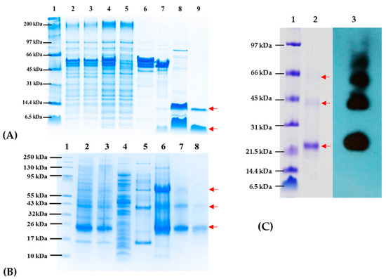 Purification steps of NG06 (A) and NG19 (B) and immunodetection by Western Blot (C). Line 1A, 1B, and 1C: Molecular weight marker, Line 2A and 2B: total fraction, Line 3A and 3B: insoluble fraction, Line 4A and 4B: soluble fraction, Line 5A and 5B: non-bound fraction obtained after purification by IMAC, Line 6A, and Line 6B: bounded fraction obtained after purification by IMAC, Line 7A: fraction bound after second IMAC, Line 7B: Refolding/SEC fraction, Line 8A: unbound fraction after second IMAC, Line 9A, 8B, and 2C: fraction obtained after SEC. Line 3C: Immunodetection by Western blot employing NG19 as antigen and NG06 immunized sera. Red arrows point to the purified, oligomeric antigens.