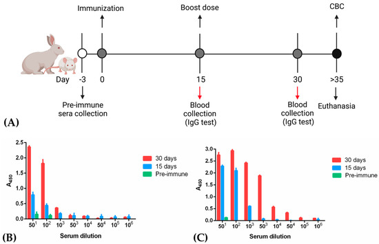 Antigens were employed in immunization schemes for rabbit antibodies production (Figure 4A). NG06 and NG19 antigens were administered subcutaneously and intramuscularly in two female New Zealand rabbits. IgG quantification using immune plasma revealed recognition of recombinant antigens at a serum dilution of 1 to 106; however, a higher titration was observed when NG19 was employed. Both antigens evoked a more efficient response when a second boost was employed (Figure 4B,C) with CBC values (Table S3). Furthermore, an ELISA assay was performed to assess antibodies specificity, using as antigens the NATtrol ™ Respiratory Panel 2 (RP2) Controls (Zeptometrix Corporation, Buffalo, NY, USA) respiratory pathogens panel and the 15 dpi and 30 dpi preimmune serum of the rabbits. The ELISA assay failed to recognize antigens present in the human respiratory extracts contained in the panel and were not statistically significant with respect to preimmune sera (data not shown). Additionally, we compared the affinity of theses polyclonal antibodies to several antigens, including native RBD protein; NG06 and NG19 antigens; showing an increased affinity in rabbit sera samples (Figure S7).
