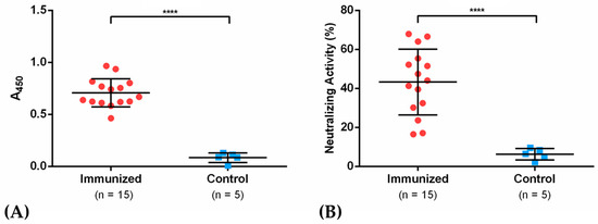 The SARS-CoV-2 Surrogate Virus Neutralization Test (sVNT) (GenScript, Piscataway, NJ, USA) was assayed with sera of immunized mice, collected at 30 dpi, according to the manufacturer’s recommendations.