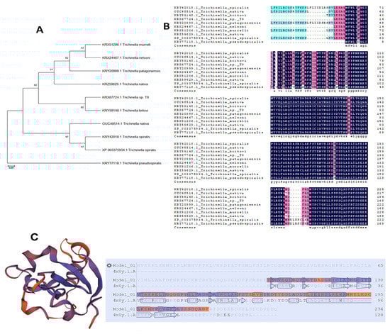 Phylogenetic tree and multiple sequence alignment. (A) A phylogenetic tree of Ts-MAPRC2 and homologs with other species. (B) Multiple Sequence Alignment of Ts-MAPRC2 by Clustal Omega with other Trichinella species. Different colors show the amino acid identity, and gaps represent the sequence with other Trichinella species, respectively. (C) The predicted Ts-MAPRC2 3D model from the crystal structure of the human PGRMC1 cytochrome b5-like domain (4 × 8y.1.A) with 42.50% of identity (Figure 1C).