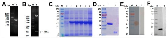 Cloning of Ts-MAPRC2 gene and identification of recombinant plasmid (pET-32a (+) Ts-MAPRC2. Lane M represents DNA marker (A) Lane 1; Ts-MAPRC2 gene amplified by PCR (B) Lane 1; Digested recombinant plasmid {(pET-32a (+)} Ts-MAPRC2 with EcoR1 and Hind III. Expression and purification of rTs-MAPRC2. Lane M: Standard molecular weight of protein marker Lane 0: Recombinant expression vector prior IPTG (isopropyl-ß-d-thiogalactopyranoside) induction. (C) Lane 1-5: Expression of rTs-MAPRC2 protein after IPTG induction at different time points. (D) Lane 1: Purified expression of the rTs-MAPRC2 protein. Lane 2: Expression of pET-32a protein resolved on SDS-PAGE. (E) M: Standard marker molecular weight. Lane 1: Purified rTs-MAPRC2 protein was transferred to the membrane and probed with SD rat serum immunized by rTs-MAPRC2 protein. Lane 2: Membrane probed by normal rat serum as control. (F) Western blot analysis of native Ts-MAPRC2 protein. Lane 1: Ts-MAPRC2 native protein detected by anti-rTs-MAPRC2 rat sera; Lane 2: no protein was detected with normal rat sera.