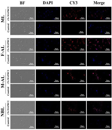 IFA was performed to determine the presence of the Ts-MAPRC2 gene at different developmental stages using anti-rTs-MAPRC2 rat serum, Cy3-conjugated secondary antibody, and DAPI (nuclei dye). The cross-section cells of all developmental stages [ML, F-AL, M-AL, and NBL] of T. spiralis were studied. As shown in Figure 4, Cy3-labeled Ts-MAPRC2 gene, DAPI-labeled nuclei displayed red and blue fluorescence for all stages cross-section cells (ML, F-AL, M-AL, and NBL) respectively. ML and F-AL stages showed high Ts-MAPRC2 gene localization as compared to M-AL and NBL stages. Moreover, F-AL showed high immunolocalization compared to M-AL. However, no red fluorescence was observed in all stages (ML, F-AL, M-AL, and NBL) of the control groups.