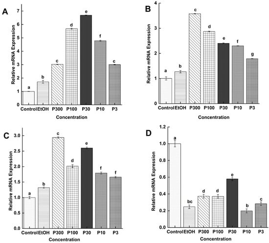 The data were analyzed by one-way analysis of variance (ANOVA) followed by Tukey’s and LSD (Least significant difference) using analytical statistics software Statistix 8.1. (2003) (Tallahassee, FL, USA). The RT-qPCR data were normalized using 2−ΔΔCt in Microsoft Excel 2010 (Redmond, Washington, USA) and a T-test was used to compare between treatments (each sample replicated three times). Origin software (Origin Pro 2021, Origin Lab Corporation, Northampton, MA, USA) was used to perform figures. Statistical data were presented as mean ± SD (n = 3). p ≤ 0.05 was considered significant.