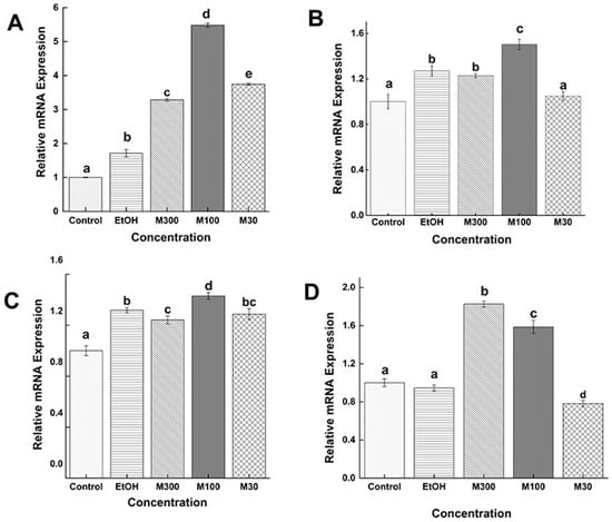 Relative expression of the Ts-MAPRC2 gene in the F-AL stage at different concentrations of mifepristone (M300 ng/mL, M100 ng/mL, and M30 ng/mL) with the control group (only RPMI) and control vehicle ethanol (EtOH-RPMI) are presented in Figure 6A. All concentrations showed up-regulation of the Ts-MAPRC2 gene as compared with control (only RPMI) and control vehicle ethanol (EtOH-RPMI), but M100 (ng/mL) showed high up-regulation expression of the Ts-MAPRC2 gene compared to all other treatment concentrations with their both controls (only RPMI and EtOH-RPMI) (p ≤ 0.05). Figure 6B shows the comparative expression of the Ts-MAPRC2 gene in the M-AL stage at different concentrations of mifepristone with control (only RPMI) and control vehicle ethanol (EtOH-RPMI). Here only M100 (ng/mL) showed up-regulation of the Ts-MAPRC2 gene as compared with control and control vehicle ethanol (EtOH-RPMI); however, the M300 (ng/mL) showed expression same as control vehicle ethanol (EtOH-RPMI), and the M30 (ng/mL) showed expression same as control (only RPMI) (p ≤ 0.05). Figure 6C shows the comparative expression of the Ts-MAPRC2 gene in the ML stage at different concentrations of mifepristone with control (only RPMI) and control vehicle ethanol (EtOH-RPMI). In the ML stage, M100 (ng/mL) showed up-regulation of the Ts-MAPRC2 gene as compared with control (only RPMI) and control vehicle ethanol (EtOH-RPMI) but M300 (ng/mL) and M30 (ng/mL) showed almost the same expression compared with both controls (only RPMI and EtOH-RPMI) (p ≤ 0.05). Figure 6D shows the relative expression of the Ts-MAPRC2 gene in the NBL stage at different concentrations of mifepristone (M300 ng/mL, M100 ng/mL, and M30 ng/mL) with control (only RPMI) and control vehicle ethanol (EtOH-RPMI). In the NBL stage, the expression decreased in descending order from high concentration (M300 ng/mL) to low concentration (M100 ng/mL) compared with both controls (only RPMI and EtOH-RPMI) (p ≤ 0.05). But (M30 ng/mL) showed downregulation respectively (p ≤ 0.05).