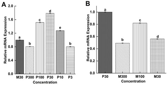 Figure 6 shows the comparative expression of the Ts-MAPRC2 gene in all stages at different doses of mifepristone with controls. In the F-AL stage, only M100 ng/mL showed high up-regulation expression of the Ts-MAPRC2 gene that confirms this concentration is good as antagonists against progesterone receptor (PR) as well as abortifacient activities []. Further, we confirmed through a cross-comparison expression of the Ts-MAPRC2 gene among the P4 and RU486 at the F-AL stage by P30 ng/mL and M30ng/mL used as controls. Figure 7A shows that P100 ng/mL, P30 ng/mL, and P10 ng/mL result in upregulation, while P300 ng/mL, P3ng/mL showed downregulation with M30 ng/mL as control, but it was noted that P30 ng/mL still shows high up-regulation. Figure 7B shows that all concentrations of mifepristone caused down-regulation compared to P30 ng/mL as control (p ≤ 0.05). Finally, we concluded that the progesterone (P4) upregulates the Ts-MAPRC2 gene at a low concentration of P30 ng/mL but downregulate at P300 ng/mL, in the F-AL stage compared with M30 ng/mL positive control, this corroborated with the findings of Nuñez et al. [] indicating more resistance against T. spiralis due to a high progesterone level compared with virgin rats. In vitro trials showed that pregnant rat sera could interrupt mortality of NBL of T. spiralis []. Although, mifepristone (antagonist) downregulated the Ts-MAPRC2 gene at all concentrations compared with P30 ng/mL as a positive control which claims that the mifepristone (RU486) functions as antagonists against progesterone receptor (PR) and abortifacient activities [].