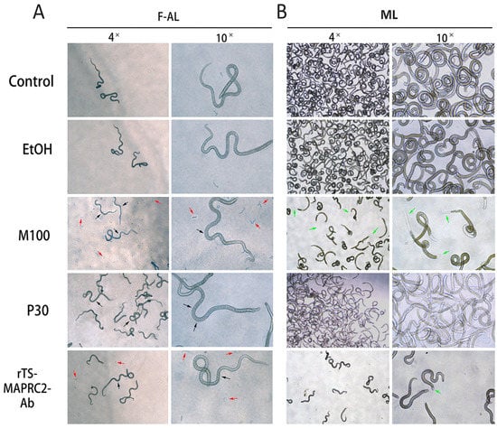 The in vitro phenotypic effect of P30 (ng/mL), M100(ng/mL), and rTs-MAPRC2-Ab on F-AL (female adult worm) and ML (muscle larvae) stages were observed. (A) Compared the phenotypic appearance of pregnant female adult worm (F-AL) among P30 (ng/mL), M100(ng/mL), and rTs-MAPRC2-Ab with both controls (only RPMI and EtOH-RPMI). Black arrows presented a female pregnancy site while red arrows present newborn larvae (NBL) at objectives 4× and 10×. (B) Compared the phenotype appearance of muscle larvae (ML) among P30 (ng/mL), M100(ng/mL), and rTs-MAPRC2-Ab with both controls (only RPMI and EtOH-RPMI) to observed ecdysis (molting process is shown by green arrow) and motility at objective 4× and 10×.