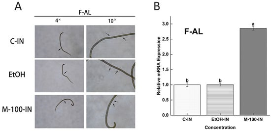 The in vivo phenotypic effect and relative mRNA expression of mifepristone (M100 ng/mL) on F-AL (female adult worm) were observed. (A) Compared the phenotypic appearance of early pregnancy stage of female adult worm (F-AL) among M100(ng/mL) with control and adjuvants EtOH-IN (olive oil-ethanol) at objective 4× and 10×. (B) Relative mRNA expression of Ts-MAPRC2 at F-AL (female adult worm) phase of T. spiralis by in vivo study. Here, a comparison between M100 (ng/mL) with a simple control group and adjuvants EtOH-IN (Olive oil-ethanol) group. Statistical data were presented as mean ± SD. p ≤ 0.05 was considered significant. The same letters mean nonsignificant and different letters mean significant.