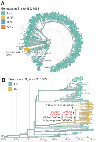 The novel B.1.362+L452R variant forms a distinct cluster in a phylogenetic tree representing randomly chosen sequenced samples from Israel (Figure 1A), constructed as part of the national program for SARS-CoV-2 whole genome sequencing and variant surveillance. The variant emerged from the B.1.362 background lineage, which was one of the two most widespread lineages in Israel along with B.1.1.50 [30] until December 2020, when the Alpha variant was imported into Israel, quickly spread and became the dominant variant in Israel. Although the B.1.362 background lineage is detected in numerous countries, only sequences of this lineage originating in Israel formed a cluster representing the B.1.362+L452R variant. The variant is characterized by two non-synonymous mutations in the S protein, L452R (T22917G), which lies within the receptor binding domain (RBD), and L1063F (G24751T), in addition to a non-synonymous mutation in the NSP16 gene in D2179Y (G20002T) and a synonymous mutation in the M protein in G26840A. An additional characterizing mutation in the ORF3a gene—W131C (G25785T)—was acquired at a later time-point and exists in most of the variant sequences (Figure 1B).