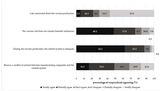 Our online survey showed a generally positive attitude and good confidence regarding vaccine manufacturing: i.e., 70.3% of respondents were totally and partially concerned about the vaccine production, 75.6% totally and partially agreed with the absence of harmful substances in the vaccine vial and 87.4% trusted control authorities during the production process. These positive attitudes resulted independently from sex, work/education in HC and having minor offspring. However, almost half of the participants totally or partially agreed that there was a conflict of interest between manufacturing companies and control systems. Importantly, we found a statistically significant difference in conflict of interest between people having or not having minor offspring (p < 0.05) and people working/educated in HC and not HC (p < 0.001). Actually, we found that subjects who had minors were more inclined to believe that a conflict of interest may exist (totally agree 28.95% vs. 11.34%); similarly, subjects not working/educated in HC agreed more with the conflict of interest (totally agree 22.73% vs. 4.26%). Thus, it is remarkable how having minor offspring and, more importantly, having a healthcare background, may impact the positive perceptions and attitudes towards the vaccine production process.