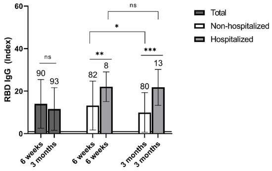 Mean levels of specific RBD IgG antibodies for individuals with past COVID-19 at 6 weeks and 3 months post infection. Results are presented for the whole group and according to hospitalization. Sample sizes are shown above standard deviation (SD) error bars. Horizontal line at an index of 1 indicates test cut-off. * p ≤ 0.05; ** p ≤ 0.01; *** p ≤ 0.001; ns—non-significant.