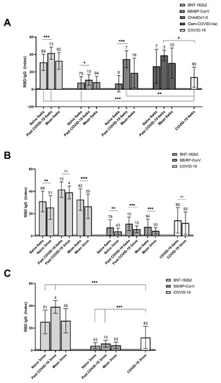Mean levels of SARS-CoV-2 spike protein RBD-specific IgG antibodies post vaccination according to pre-vaccinal COVID-19 status, and post infection. (A)—in recipients of BNT-162b2, BBIBP-CorV, ChAdOx1-S, and Gam-COVID-Vac vaccines at 6 weeks post vaccination, as compared with non-vaccinated individuals with past COVID-19 at 6 weeks post infection. (B)—kinetics of antibody levels in recipients of BNT-162b2 and BBIBP-CorV from 6 weeks to 3 months post-vaccination, and in non-vaccinated individuals with past COVID-19 from 6 weeks to 3 months post infection. (C)—in recipients of BNT-162b2 and BBIBP-CorV at 3 months post vaccination, as compared with non-vaccinated individuals with past COVID-19 at 3 months post infection. (A–C)—Sample sizes are shown above standard deviation (SD) error bars. Horizontal line at an index of 1 indicates test cut-off. * p ≤ 0.05; ** p ≤ 0.01; *** p ≤ 0.001; ns—non-significant; wks—weeks; mos—months.