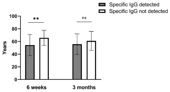 Age (mean ± SD) of BBIBP-CorV recipients according to the presence of SARS-CoV-2-specific IgG antibodies at 6 weeks and 3 months post vaccination. ** p ≤ 0.01; ns—non-significant.