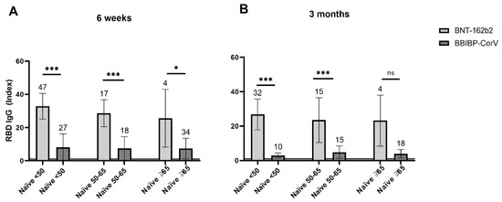 Mean levels of SARS-CoV-2 spike protein RBD-specific IgG antibodies post vaccination in naïve recipients of BNT-162b2 and BBIBP-CorV according to age (<50, 50–65, ≥65). (A)—at 6 weeks post vaccination, (B)—at 3 months post vaccination. (A,B)—Sample sizes are shown above standard deviation (SD) error bars. Horizontal line at an index of 1 indicates test cut-off. * p ≤ 0.05; *** p ≤ 0.001; ns—non-significant.