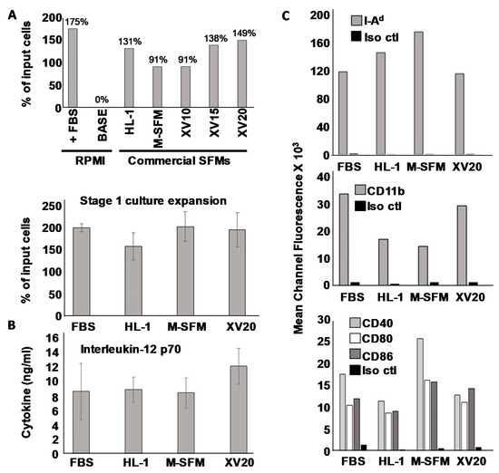 As our initial comparison of efficiency, after 6 days of stage I culture we harvested cells and assessed viability by Trypan Blue dye exclusion, and calculated overall percent expansion by comparing the total number of input cells with viable harvested cells at the end of the expansion period. We found that of the seven different conditions, FCS-containing RPMI medium appeared to perform marginally the best with 175% expansion. However, the highest performing serum-free media was not far behind, with X-Vivo 20 posting 149% expansion, X-Vivo 15 138%, HL-1 131%, and both X-Vivo 10 and macrophage SFM media at 91% (Figure 1A, upper panel). Only RPMI base medium without any FCS was completely unable to support measurable Stage I expansion or viability of the bone marrow cells across the 6-day culture period. Microscopically, the cells grown in commercial serum-free media all appeared similar to those grown in conventional serum-containing RPMI after subsequent stage II culture and activation (Supplementary Materials Figure S1).