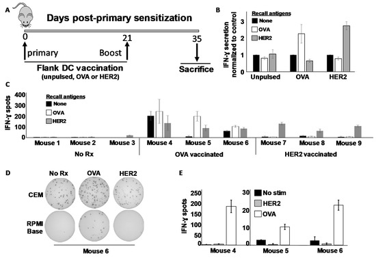 We next sought to determine whether the SFM-DCs could sensitize T cells to either MHC class I- or MHC class II-restricted antigens, choosing the rat ErbB2/HER-2 (rHER-2) protein sequence (i.e., TYVPANASL) previously identified as an H-2Kd-restricted (i.e., MHC class I) CTL epitope often referred to as “p66” [24], and the well-characterized I-Ad-restricted (i.e., MHC class II) Th epitope of ovalbumin (323–339) [26]. Mice were vaccinated in the flanks on day 0 and boosted once on day 21 (Figure 2A). Fourteen days after the last vaccination Day 35), mice were sacrificed and their splenocytes stimulated in vitro with various recall antigens, and IFN-γ response evaluated both by ELISA and ELISPOT assays. From ELISA analysis, it was clear that splenocyte cultures from OVA-vaccinated mice secreted IFN-γ when stimulated with OVA but not rHER-2 peptides (Figure 2B). Conversely, splenocytes from rHER-2-vaccinated mice secreted the cytokine in response to rHER-2 but not OVA peptides. Sham-vaccinated mice showed no such response to either peptide. Tandem ELISPOT analysis revealed a similar picture, but with one caveat; some OVA-vaccinated mice displayed an unusually high background not demonstrated by rHER-2 vaccinated mice (Figure 2C and Supplementary Materials Figure S3).