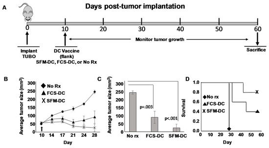 Comparison of efficacy of peptide-pulsed DCs cultured in serum-free versus serum-replete medium in a therapy model for HER2pos breast cancer. (A) Schema of therapy protocol. On day 0, fifteen female Balb/c mice received 1 × 106 orthotopically-implanted TUBO breast carcinoma cells. On day 10 mice were divided into three groups (five mice each) and vaccinated subcutaneously in the flank with rat ErbB2/HER2 class I peptide (TYVPANASL) pulsed either onto DCs cultured in X-Vivo 20 (SFM-DC) or in RPMI supplemented with 10% fetal calf serum (FCS-DC). Alternatively, mice were left untreated (No Rx). (B) growth curves of tumors over the course of 28 days. (C) Average tumor size comparison on day 28 with statistical analysis. (D) Kaplan–Meyer survival plot where vaccinated mice were followed for an additional 30 days. Failure to survive was defined as tumor size exceeding size of 200 mm2.