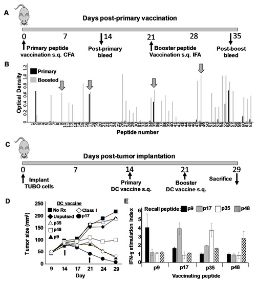 Whereas historically, CD8pos cytotoxic T cells have been regarded as the primary T cell arm for anti-tumor immunity, more recently the contributions of Th cells are being appreciated [30]. We therefore next sought to identify novel Th epitopes on rErbB2/HER2 and test these peptides in therapy models compared with the well-characterized rErbB2/HER2 CTL epitope p66. We began these studies by constructing a peptide library consisting of a series of 62 peptide 20-mers each overlapping by 10 amino acids and spanning the entire extracellular domain of rErbB2/HER2 (Supplementary Materials Figure S5). Because we expected only a minority of these 62 peptides to contain Th epitopes, we devised a screening step to economically filter out uninteresting peptides. To accomplish this, we partitioned the 62-peptide library into twelve pools of five or six peptides each, emulsified the individual pools in complete Freund’s adjuvant, and vaccinated mice subcutaneously in the flanks (Figure 5A). After 21 days, mice received a booster immunization with the same peptide pool emulsified in incomplete Freund’s. Blood was removed from the mice 12–14 days after each vaccine and the presence of serum antibodies (IgG) against individual peptides within each of the vaccinating pools determined via ELISA analysis (Figure 5B). We reasoned that since IgG secretion by B cells requires T cell help, an individual peptide’s capacity to induce IgG production likely indicated the presence of an embedded Th epitope stimulatory to CD4pos T cells. We observed that peptides fell into three distinct categories: first, those that provoked little or no IgG on either primary sensitization or boosting (e.g., 3–5, 19–25, 42–46, etc.); second, those that demonstrated weak or no IgG on primary sensitization, but became strong after one boost (e.g., peptides 6, 9, 26, 48 and 57); and finally, those that induced a strong response after only one sensitization (e.g., peptides 17, 35 and 56). Naturally, the non-immunogenic peptides in the first category were immediately dismissed as unworthy of further study. We then selected four putative epitopes for further analysis: two each from the latter categories, including p9 and p48 from category two, and p17 and p35 from category three.