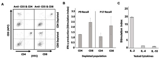 Single cell suspensions of splenocytes were prepared from the excised spleens of mice vaccinated once with DCs pulsed with P9 or P17 (three mice per peptide for a total of six mice). Spleen cell preparations from each individual mouse were divided in half for either CD4pos depletion or CD8pos depletion. The MidiMACS system (MidiMACS separator, LS Columns, CD8 (TIL) Microbeads, and CD4 (L3T4) Microbeads) was used for depletion via manufacturer’s instructions (Miltenyi Biotec, Bergisch Gladbach, Germany). Following separation, the preparations were analyzed via flow cytometry to ensure successful depletion and used in an in vitro recall assay for the vaccinating peptide (P9 or P17). Recall of antigen was assessed from 24 h stimulated culture supernatants using BD OptEIA mouse IFNγ ELISA set (BD Biosciences, San Diego, CA, USA) via manufacturer’s instruction. A stimulation index (IFN-γ output in stimulated divided by unstimulated cells) was determined for each individual mouse and then averaged.