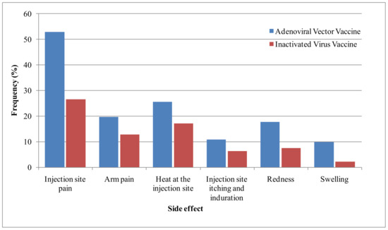 Another highly associated factor with all side effects (87.3% vs. 60.6%), local side effects (75.5% vs. 51.1%) and systemic side effects (77.5% vs. 46.8%) was the use of the adenoviral-based vaccines, compared with the inactivated-virus vaccines. In addition, the use of adenovirus-based vaccines in primer–booster doses was associated with high frequencies of total, local, and systemic side effects, while the use of inactivated-virus vaccines was associated with the lowest frequencies.