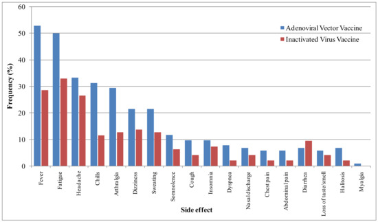 - Lounis, M.; Rais, M.A.; Bencherit, D.; Aouissi, H.A.; Oudjedi, A.; Klugarová, J.; Pokorná, A.; Klugar, M.; Riad, A. Side Effects of COVID-19 Inactivated Virus vs. Adenoviral Vector Vaccines: Experience of Algerian Healthcare Workers. Front. Public Health 2022, 10, 896343. [Google Scholar] [CrossRef]