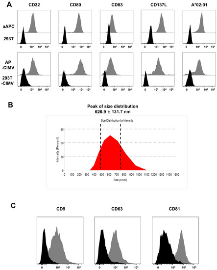 Characterization of AP-CIMVs generated from aAPC expression co-stimulatory molecules and HLA-A*02:01. (A) The expression of CD32, co-stimulatory molecules (CD80, CD83, and CD137L) and HLA-A*02:01 on the surface of aAPCs and AP-CIMVs was analyzed via flow cytometry. (B) The size of AP-CIMVs was measured via Zetasizer Nano ZS. Majority of the size was confirmed at 626.9 ± 131.7 nm. (C) The expression of extracellular vesicle markers (CD9, CD63, and CD81) on the surface of AP-CIMVs was analyzed via flow cytometry. Black histograms indicate isotype control, and gray histograms indicate anti-CD9, CD63, or CD81 stained samples.