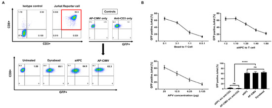 GFP expression in Jurkat reporter cells was induced by stimulation with aAPC and AP-CIMVs coated with anti-CD3 antibody or anti-CD3/CD28 Dynabead. Jurkat reporter cells were first gated with CD3+CD8+ cells, and GFP expression was measured via flow cytometry (Figure 3A). GFP expression in Jurkat reporter cells was induced in a dose-dependent manner in all three groups. Anti-CD3/CD28 Dynabead at a bead:Jurkat reporter cell ratio of 5:1, aAPC at Jurkat reporter cell:aAPC ratio of 10:1, and AP-CIMV at 25 μg/1 × 105 Jurkat reporter cells showed GFP expression of 69.1%, 64.9%, and 63.3%, respectively (Figure 3B). When Jurkat reporter cells were stimulated with AP-CIMVS alone or anti-CD3 antibody alone, GFP expression was not induced as much as in anti-CD3-coated AP-CIMVs. These results suggest that CD3 signaling using AP-CIMVs is comparable to that using aAPCs or anti-CD3/CD28 Dynabeads.