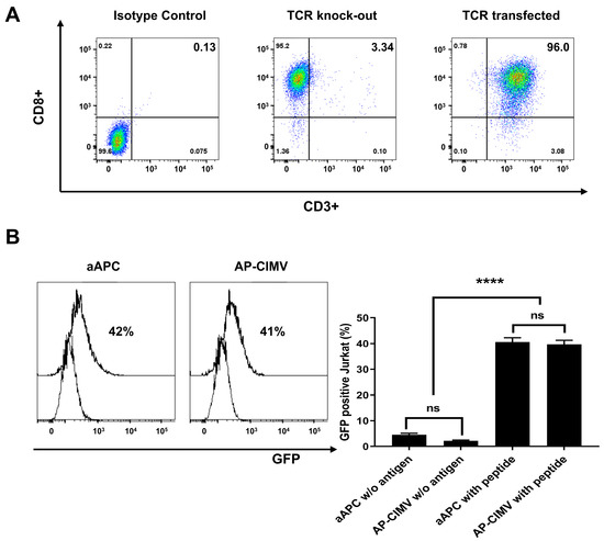 Activation of Jurkat reporter cells expressing CMV-specific TCR by aAPCs and AP-CIMVs expressing HLA-A*02:01 and loaded with CMV pp65 peptide. (NLVPMVATV) (A) In Jurkat cells in which the endogenous TCR was removed by Crispr/cas9, CD3 molecules do not appear on the cell surface. When mRNAs of HLA-A*02:01-restricted and CMV pp65-specific TCR alpha and beta genes were transferred, the reappearance of CD3 molecules on the cell surface indicated expression of the transferred TCR gene. (B) Induction of GFP expression in Jurkat reporter cells expressing specific TCR stimulated by aAPCs or AP-CIMVs expressing HLA-A*02:01 loaded with CMV pp65 epitope peptide in the negative control group, aAPC or AP-CIMVs alone without antigen peptide was used for stimulation. Error bars display mean values ± SD of triplicate. p value was calculated via one-way ANOVA. **** p< 0.0001.
