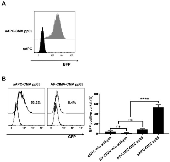 Activation of Jurkat reporter cells expressing specific TCR by aAPCs and AP-CIMVs presenting endogenously processed CMV pp65 antigen. (A) BFP co-expressed with CMV pp65 in aAPCs was analyzed via flow cytometry. (B) Jurkat reporter cells expressing specific TCR were stimulated with aAPCs expressing HLA-A*02:01 and CMV pp65 antigen (10:1) and their AP-CIMVs (25 ug), and then, the GFP expression was measured via flow cytometry. In the negative control group, aAPCs without antigen expression or their AP-CIMVs alone were used for stimulation. Representative data are presented. Error bars display mean values ±SD of triplicate. p value was calculated via one-way ANOVA. **** p < 0.0001.
