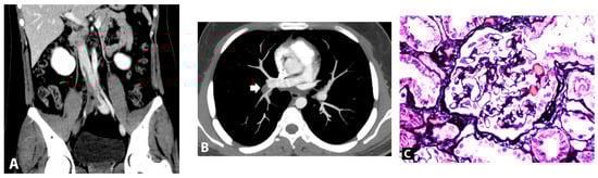 (A). Computed tomography showed partial thrombosis of the inferior vena cava and total occlusion of right iliac veins (asterisk). (B). Axial computed tomography pulmonary angiography image showed pulmonary embolism at the right descending pulmonary artery (arrow). (C). Kidney biopsy finding, light microscopy of glomerulus with Jone silver stain (original magnification, ×200) revealed normal glomerulus.