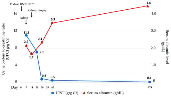 SARS-CoV-2 vaccines, especially mRNA vaccines, can reduce the symptomatic infection and severe infection of the Omicron strain of Coronavirus disease (COVID-19) []. The common adverse events of BNT162b2 injection include fatigue, headache, muscle pain, and fever []. However, rare kidney adverse events, including interstitial nephritis and glomerular diseases were sporadically observed, although a causal relationship could not be inferred. Reported glomerular diseases consist of MCD (most common), followed by membranous nephropathy, IgA nephropathy, anti-glomerular basement membrane nephritis, and antineutrophil cytoplasmic antibodies (ANCA) associated vasculitis []. MCD was hypothesized to be a result of a prevalence of circulating CD8+ T suppressor cells, type 2 T helper cells (Th2), and cytokines produced from Th2 (interleukin (IL) 4, IL8, and IL13) that can injure the foot processes of podocytes [,]. A reduced function of regulatory T cells is also a proposed mechanism. The secondary causes of MCD involve allergy, malignancies, some drugs, infections, and autoimmune disorders []. After SARS-CoV-2 infection, SARS-CoV-2-specific T cells can be detected in blood circulation 2–4 days after the onset of symptoms []. This could infer that T cells are activated within one week after the SARS-CoV-2 vaccination. It would be of interest if the cytokines were consecutively measured during the cause of MCD to confirm this causal relationship; unfortunately, the investigations were not performed. However, an elevation of non-specific systemic inflammatory response parameters, including CRP and complement levels [], was demonstrated in this patient, possibly indicating immune activation following BNT162b2 vaccination. Although a causal relationship between vaccines and the disease cannot be concluded, the temporal association between administration of vaccination and the onset of nephrotic syndrome supports the relationship as documented by the presented case and reports from other groups [,,,,,,]. Additionally, the fact that all potential secondary causes of MCD were excluded, together with the spontaneous resolution of the disease without steroid treatment, strongly supports the causal relationship between the vaccine and MCD.