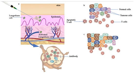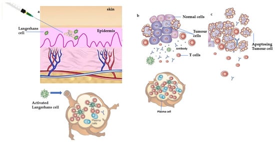 DNA vaccines are an intriguing approach in the immunotherapy of cancer. These vaccines were discovered in the 1990s as a result of DNA-mediated influenza vaccination []. DNA vaccines consist of bacterial plasmids with double-stranded DNA that have two replication origins. They also have a polyadenylation motif and a regulator that resembles the human cytomegalovirus. The bovine growth hormone (BGH) gene provides the polyadenylation sequence, and the CMV promoter causes the transgene to be overexpressed in the host cell of the mammals. DNA vaccines are referred to as vaccines of the third generation. These vaccinations constitute of genetically implanted DNA which encodes for an antigen of intended bacteria or viruses via a robust promoter present in the DNA plasmids. The antigens that are encoded would then elicit a strong immune function in the host []. DNA vaccines must reach the nucleus to undergo transcription and then the encoded antigens will be translated inside the cytoplasm. MHC-I and MHC-II molecules then further process the antigen and convey it to CD8+ T- and CD4+ T-cells to initiate immunogenicity []. The Food and Drug Administration of the USA regulates the DNA vaccines for medicinal and therapeutic uses in the veterinary field. Immunoregulatory cognition has been found to be improved by this vaccine []. The channel via which DNA vaccines are administered is thought to have a significant impact on the effectiveness of the vaccine. Targeting distinct APCs inside diverse tissues can help a vaccine to induce the necessary response []. These vaccines are frequently administered intravenously as well as topically []. Parenteral routes, such as intravenous, subcutaneous, and intramuscular, are most frequently used for the delivery of DNA vaccines. These routes activate tissue-specific APCs, which in turn stimulates cellular and humoral immune reactions. Due to its ability to induce localized immunity at body regions that serve as the characteristic entry points for numerous microorganisms, the delivery of DNA vaccines via mucosal channels has recently attracted a lot of attention []. DNA vaccine action mechanisms are classified into three types: The first pathway includes the entry of the DNA inside the somatic cell, for example the muscle cell, which undergoes translation, and after that MHC-1 molecules transmit DNA-encoded antigens directly to cytotoxic CD8+T-cells []. In a few instances, the antigen expressed by DNA in somatic cells is liberated by emitting the apoptotic bodies, and this would include the second pathway. Such peptides are then endocytosed by phagocytic cells, metabolized by APCs, and cross-presented to CD4+ T-cells by MHC-II molecules. The direct DNA transfection of APCs includes the third route []. Such vaccines have significant advantages that include convenience of design, relatively low cost, long-term stability, an optimum dissolution rate, and even the capacity to be speedily amended []. Despite the poor immunogenicity of DNA vaccines in clinical studies, technological advancements such as delivery systems and the use of immuno-stimulatory agents such as adjuvants may contribute to a better result []. The concept of using xenogeneic antigens in DNA vaccines to cure melanoma and overcome systemic immune tolerance has recently been studied. In recent cancer studies, xenogeneic p53 antigen is employed to produce DNA vaccines to combat colon cancer []. Furthermore, many new preclinical studies have shown that a DNA vaccine encoding the prostate-associated antigen prostatic acid phosphatase (PAP) can elicit PAP-specific CD8+ T-cell immune responses, as seen in a phase I/II study employing a DNA vaccine that encoded human PAP conducted in 22 prostate cancer patients []. There are many methodologies for increasing the therapeutic efficacy of DNA vaccines. A potent promoter sequence is required for efficient transcription. Powerful promoters have also been shown to enhance the expression of antigen efficiency []. Enhancing the layout of tumor-specific antigens is also critical in enhancing the DNA vaccines. Immuno-stimulatory cytokines can also aid in enhancing the vaccine’s impact on effector T-cells. They are typically encoded by the vaccine that incorporates antigens, by some other plasmid, and are administered as proteins along with the vaccine. The most frequently employed cytokines in the latest research include IL-12, GM-CSF, as well as IL-2. Various approaches are combined with DNA vaccinations to increase their efficacy, including endocrine therapy and radiotherapy [].