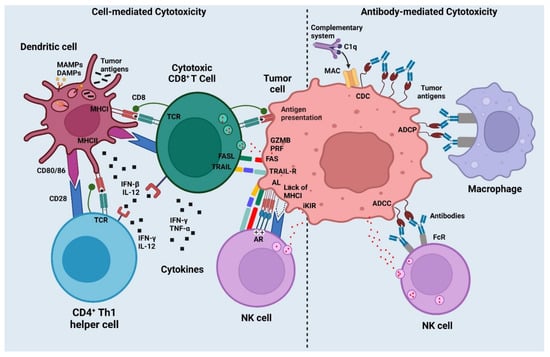 For a therapeutic cancer vaccine, it is a prerequisite that it triggers a strong immunological reaction, precisely recognizes, and gets rid of tumor cells (primary and secondary), is antigen-specific, has minimal systemic side effects, and does not generate autoimmune responses []. Another consideration is that the vaccine must induce a robust immunological recall to counteract cancer cells, which is critical to attain long-term disease resolution []. In reality, relapses, rather than the primary tumor, have been largely blamed for the high cancer mortality rate []. The aim of immunotherapy-based cancer vaccines is to activate the endogenous cellular- or humoral-acquired immune system against cancer. Mostly, cancer vaccines induce the production of cancer-specific CD8+ T-cells that specifically recognize and kill cancer cells []. Tumor antigen-specific cytotoxic T lymphocytes (CTLs) recognize cancer antigen epitopes by binding to their T-cell receptor (TCR). Furthermore, CTLs via several TCR signaling pathways, such as degranulation (release of perforin/serine protease), or via upregulation of cluster of differentiation ligand (CD95L) or TNF-related apoptosis-inducing ligand (TRAIL), induce cancer cell death. For effective use, CTLs need to be trained by tumor dendritic cells (DCs). Type 1 conventional CD103+ migrating DCs are antigen-presenting cells (APCs) that elucidate CTLs before cancer cell detection via three different mechanisms: cancer antigen adhered to MHC-I, co-stimulatory molecules (CD80/86 and CD28/152), and pro-inflammatory cytokines (IL-12 and TNF-α) []. CTLs and CD4C Th cells develop certain characteristics upon activation that greatly influence the subsequent efficiency of CTL cytotoxic responses []. In addition, cytokine-mediated DC licensing activates and supports CD4+ Th cells []. APCs also activate CD4+ T-cells similarly to CD8+ T-cells, except that the tumor antigen epitope is displayed on MHC-II rather than MHC-I. CTLs and CD4C Th cells develop certain characteristics after activation, that greatly influence the subsequent efficiency of CTL cytotoxic responses []. CTL phenotypes are commonly defined by the cytokine cocktail that is released via a cytotoxic mechanism to promote cell death. Many studies have demonstrated that CTL-mediated production of IFN-ϒ and TNF-α corresponds to good tumor reduction potential and improved patient endurance []. Other investigations have shown that when CD4C Th cells adopt a Th1 phenotype, characterized by the release of IFN-ϒ, TNF-α, and IL-2, patient endurance improves. Although more debatable [], it has been demonstrated that combining the Th1 response with a Th17 inclination, as defined by IL-17 production, may be even more advantageous. As each T-cell has a unique TCR that recognizes just one antigenic epitope, immunological responses that create a broad measure of antitumor T-cell levels (many T-cell clones) are stronger []. The optimum immune response to immunization may vary amongst malignancies. Cancer vaccination can also harness antibody-mediated cytotoxic pathways to limit cancer progression [] (Figure 3). Antibody-mediated cytotoxicity and antibody-mediated phagocytosis [] can be used to kill cancer cells when they bind to antibodies. Cancer vaccines based on humoral immunotherapy, aiming to elicit anticancer antibodies in the patient´s body, have mainly used these techniques for passive immunotherapy []. Immunological cells responsible for innate immunity (natural killer cells, macrophages, and neutrophils) can identify the attached antibody Fc receptors and drive cell lysis or phagocytosis, once antibodies recognize epitopes on cancer cell surfaces [].