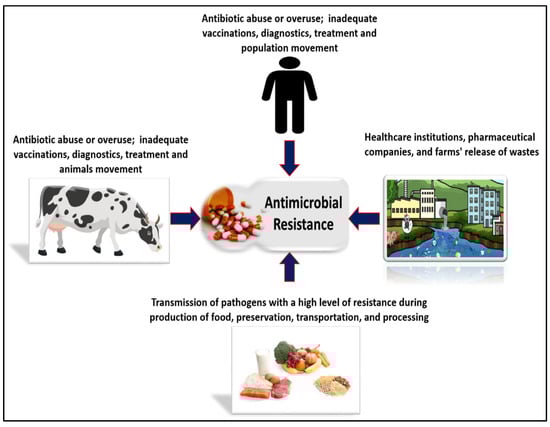 Public health concerns about antimicrobial resistance (AMR) are growing worldwide, and it is increasingly recognized as a problem of global significance []. Infections caused by bacteria, viruses, or fungi can develop AMR in response to the introduction of antimicrobial therapy []. The importance of addressing this widespread and sophisticated hazard to human health has been highlighted in countless policy studies on an international and national scale []. As this review will solely cover bacterial resistance, readers are encouraged to examine other reviews regarding viral and fungal resistance [,,]. AMR, which occurs when bacteria evolve in such a way that they become resistant to the medications used to treat diseases, poses one of the greatest risks to public health in the twenty-first century [].