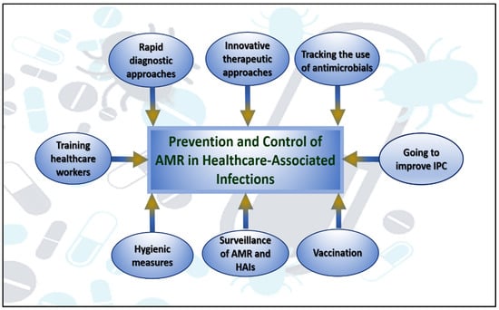 Numerous studies have linked outbreaks of infection with Enterobacteriaceae to fresh food intake. In Europe and North America, Escherichia coli O104:H4 outbreaks linked to sprouts were reported in 2011, while in the United States, Escherichia coli O157:H7 outbreaks linked to spinach were reported in 2006. Several studies have shown that the environment can facilitate the spread of AMR bacteria to humans []. Environmental factors play a critical role in the spread of AMR bacteria to humans, as opposed to contact with animal carriers, eating animal products, traveling internationally, and spreading in healthcare and community settings, where these microorganisms can disperse []. To minimize the human influence on the emergence of AMR, a number of educational, regulatory, and political measures must be taken [,,,]. As shown in Figure 2, by implementing better cleaning and hygiene practices, we can reduce the prevalence of resistant bacteria. Moreover, we need to develop new, quick, and accurate instruments for diagnosing infections. Lastly, we need to explore new therapeutic approaches to combat diseases caused by resistant bacteria [].