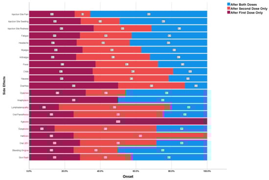 While mRNA-based vaccines recipients reported more local side effects after the first (85.6% vs. 75.4%) and second doses (84.9% vs. 79.5%), viral vector-based vaccines recipients reported more systemic side effects after the first (59.6% vs. 49.5%) and second doses (57.6% vs. 51.8%). Similarly, Klugar et al., 2021 revealed that local reactions were more associated with mRNA vaccines, while systemic adverse effects were associated with viral vector-based vaccines among German HCWs []. In Poland, Andrzejczak-Grządko et al., 2021 indicated that BNT162b2 was associated with more frequent local adverse effects, i.e., injection site pain and arm pain and less frequent systemic side effects (headache, myalgia, headache, fever, and chills) [].