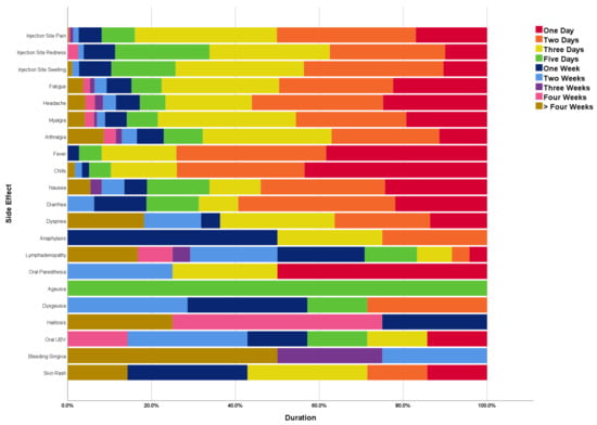 Most local adverse reactions persisted between one and three days, including injection site pain (84%), injection site swelling (74.3%) and injection site redness (66.3%). Moreover, fatigue (77.6%), headache (76.7%), myalgia (78.5%), arthralgia (67.9%), fever (91.9%), chills (89.6%), nausea (66.2%), diarrhoea (68.8%) and dyspnoea (63.6%) persisted between one and three days. On the other hand, the lymphadenopathy persisted over longer intervals, e.g., five days (12.5%), one week (20.8%), two weeks (20.8%) and more than four weeks (16.7%). Most rashes (85.7%) resolved within the first week (Figure 2).
