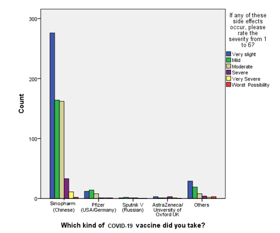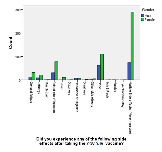 Using basic descriptive statistics, variation between males and females in terms of rating the severity of the vaccines’ side effects revealed that female participants had a higher mean score than males (2.11 vs. 1.74) Similarly using a Mann–Whitney test, it was found that females had a mean rank of 402.66, while males had a mean rank of 326.03, which is considered statistically significant as the p-value (two-tailed) was found to be <0.0001. Likewise, as presented in in Table 7, using a chi-square test, out of all the respondents, the females were found to be more susceptible to the adversities of COVID-19 vaccination (p < 0.001), with multiple (more than one side effect in one individual) side effects of slight severity (p < 0.001) (Figure 3).