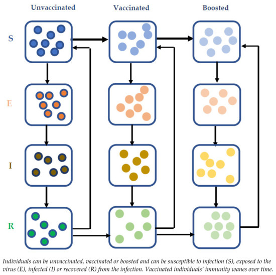 Our previously published Susceptible-Exposed-Infectious-Recovered (SEIR) transmission model of SARS-CoV-2 virus [34] was updated to capture the impact of immunity waning and booster dosing of those who had a primary series of COVID-19 vaccination (Figure 1). The model was populated with UK data as a reference case. However, the model includes important and generalisable dynamics and as such the results are likely to be applicable globally. In addition to the epidemiological parameters (population distribution by age, mixing patterns, restriction information, vaccine coverage and speed of vaccine rollout, immunity waning), model inputs included current infection levels in the population, achievable vaccine coverage forecast and rollout speed in the population. Further details regarding the disease transmission model, including the input parameters and assumptions, can be found in the supplementary material (Supplementary Methods and Tables S1–S3).