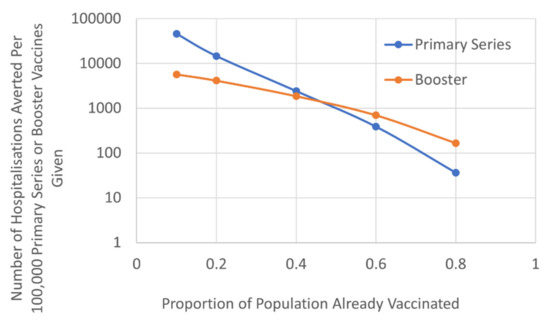 The number of COVID-19 hospitalisations prevented per 100,000 primary series or booster vaccines (logarithmic scale).
