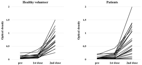 The median age of the HSCT patients was 55 years (range, 23–71 years) at the time of the first dose and 11 patients were female. The median duration between HSCT and vaccination was 1605 days (range, 163–4126 days). Only one patient who received rituximab therapy was included, and the last administration was over five years ago. Seven patients were receiving immunosuppressants at the time of the first vaccination. Two of these seven patients were taking tacrolimus alone and one was receiving tacrolimus plus concomitant steroids. Three patients took steroids alone and the other received both cyclosporine and steroid for nephrotic syndrome. Hematological disease status was stable in all patients, and none had developed COVID-19 prior to the first dose. The median level of serum IgG was 1087 mg/dL (range, 181–2169), and the median absolute lymphocyte count was 2320/μL (range, 309–4998). Regarding the 19 healthy volunteers used as a control (female, n = 7), the median age was 74 years (range, 39–82), and none had developed COVID-19 infection prior to the study.