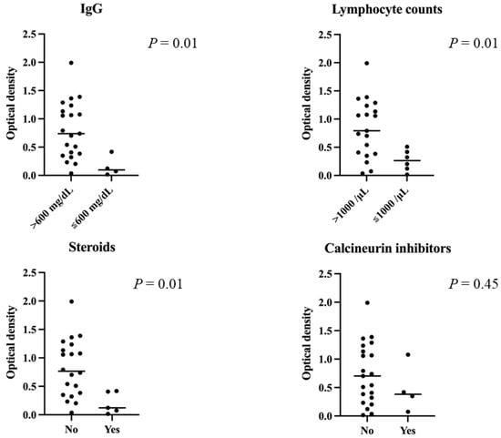 Anti-S1 titers after the second dose in each subgroup of transplant patients. Median optical density of antibody levels in patients with low IgG levels (<600 mg/dL), steroid treatment and low lymphocytes (<1000/μL) was significantly lower than in the other patients. There was no significant difference in S1-antibody titers between the group taking calcineurin inhibitors and the group not taking them (p = 0.45).