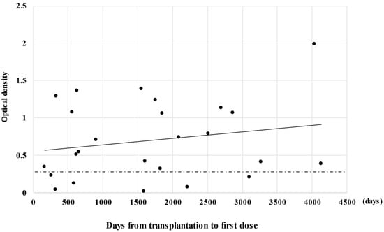 Relationship between S1 titers after the second dose and duration from transplantation to vaccination. The perforated line indicates the threshold (0.26) for seroconversion and the solid line indicates the regression line.