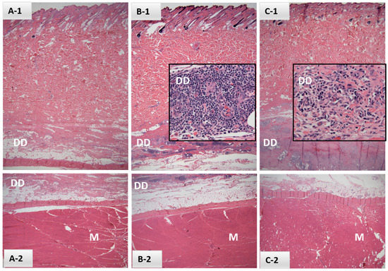Histological sections of dermis (A-1,B-1,C-1), deep dermis (DD; A-1,B-1,C-1 and A-2,B-2) and underlying muscle (M; A-2,B-2,C-2) from samples collected in Safety Study #1 from either control (A) or EBAA vaccine injection sites (B,C) at 21 days post-inoculation (H&E, 2×). Intervals between last palpable lesions and sample collection were (B) 14 days and (C) 1 day. Inserts (B-1,C-1) focus on perivascular mononuclear inflammatory cell infiltrates within the DD, consisting primarily of lymphocytes and plasma cells (40×).