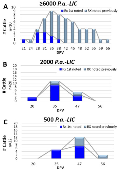 Injection site observations in Trial #4 were conducted at four time points; 20, 35, 47 and 56 DPV. Palpable reactions were noted in 61.9% (26 of 42) of the vaccinated heifers (14 of 20 in Gr 4-A and 12 of 22 in 4-B) and one heifer in placebo Gr 4-C (6.7%). The risk of developing an injection site reaction in the vaccinated animals was significant; RR = 8.79; 95% CI: 1.94–49.8. Results were similar when analyzed by the individual vaccine groups compared to the placebo group, but no difference was observed when comparing vaccinated Gr 4-A to Gr 4-B (RR = 1.1; 95% CI: 0.70–1.84). Reactions were consistent with previous studies. Areas of swelling in Gr 4-A ranged from 1.5 mm2 to 20.0 mm2, with a mean of 8.1 ± 4.5 mm2 and those in Gr 4-B ranged from 1.0 mm2 to 24.0 mm2, with a mean of 10.0 ± 6.5 mm2. Reactions were noted at 20, 35 and 47 DPV in Gr 4-A, with the majority (78.6%) noted only once (Figure 3B). By comparison, initial reaction observations in those given the lower potency of 500 P.a.-LIC (Gr 3-B) were noted at 35 and 47 DPV with reactions persisting in two heifers at 56 DPV (Figure 3C). Statistical comparisons as to whether vaccine potency influenced duration between vaccination and initial reaction observations, or duration of palpable reactions were hampered by limited data point collections.