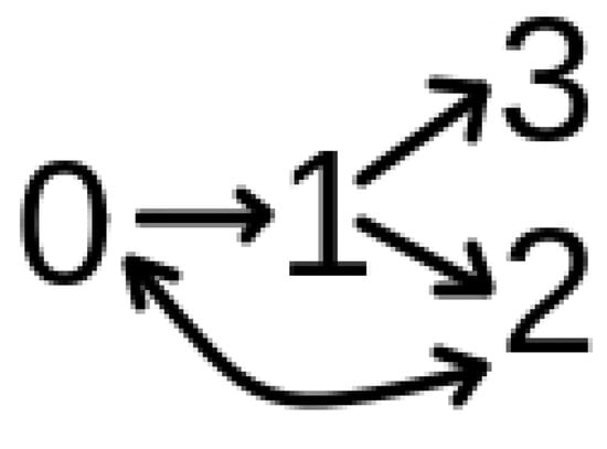The dynamics can be summarized as follows: To each individual i is assigned a variable Si that can be in four states: susceptible (0); infected (1); recovered or immunized (2); and dead (3). The entire population starts the simulation as susceptible: Si = 0. A single person among the residents is infected at t = 0 with the less lethal variant β = 0.2. The dynamics is given by the process shown in Figure 1.