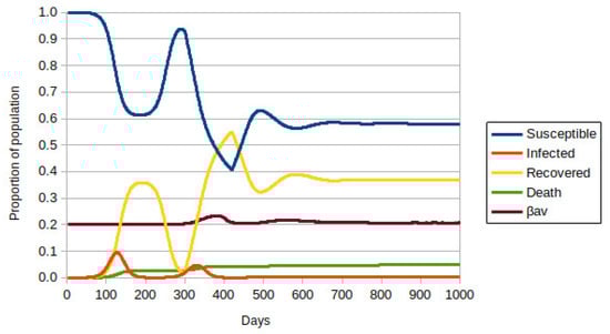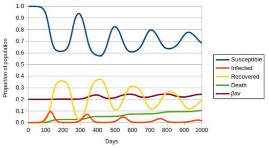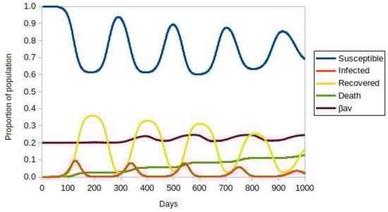 On the simulation’s 300th day, a vaccination campaign could start. Figure 2 represents the evolution of a population with 40% of social isolation, Pmov = 0.6, without vaccination. The values represent the densities relative to the initial number of residents, in this case, 874,975 people. There is an oscillating evolution of the numbers caused by the ongoing entry of infected individuals: the visitors. The curve called βav represents the average value of β taken among all individuals with S = 1. It is observed that in the peaks of infection, the most lethal variant tends to dominate. The decrease in the infected population is typical of the SIR model, but the permanence of the most lethal variant is an important characteristic. The number of individuals who died is in the order of 10% of the original population. Certainly, this is a very high number when compared to real data. This model and the simulations do not intend to project expected values, but they represent the dynamics of disseminating the most lethal variant qualitatively.