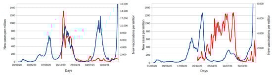Figure 5 shows the evolution of cases and vaccination of two countries with approximately the same population, Israel and Portugal [42]. It is clear how the difference in the vaccination policy adopted in those two countries has shaped the cases curve. Both countries started their vaccination around the same period (12/2020). However, the rate of vaccination was completely different. Israel started at a high rate, but it faded around three months later, while Portugal kept an increasing rate. The impact in the cases can be seen in the last peak caused by the Delta variant in the last months of 2021, which was much stronger in Israel than Portugal. The huge increase of cases on the right of both plots (early 2022) are due to the spread of Omicron, which is not affected by vaccination.