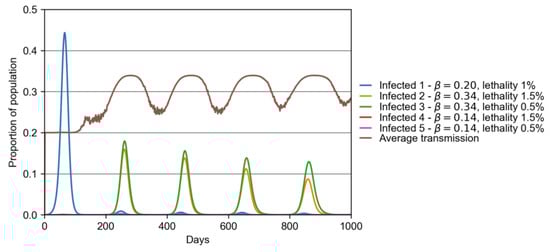 The competition among different variants can be better viewed in Figure 6. This plot shows, for the same parameters of the previous plot, how the different strains are present in the population over time. It can be seen how the original strain causes a peak of ∼45% of people infected in a first wave around day 80. However, once the four new variants are introduced in the system, the following waves show that the original variant is rapidly replaced by the two most transmissible ones (variants 2 and 3 of Table 1). Since the second wave (starting between days 200 and 300), the simulation shows a dominance of variant 3 (more transmissible, less lethal), followed by variant 2 (more transmissible, more lethal), until finally, the original variant is barely present. This plot shows two important results: (A) the new variants with less transmissibility than the original strain (variants 4 and 5) are not able to invade the city, while the more transmissible variants substituted the original one from the second wave on; (B) interestingly, the lesser lethal variant overcame the more lethal one in all the waves, which is expected for a long-term evolution of an emergent disease if the lack of host illness favors transmission, and thus, loss of virulence [43,44]. Due to the full shifting of the original strain by new variants, the β-infection rate was permanently higher after the second wave than it was at the beginning of the pandemics, as shown by the average transmission in Figure 6.