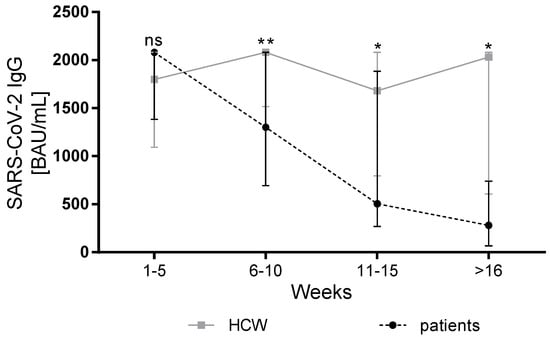 SARS-CoV-2 IgG titer in relation to the time point between the second dose and antibody detection. A comparison of the binding antibody units per milliliter (BAU/mL) ratio of SARS-CoV-2 IgG antibodies of patients with liver cirrhosis and HCWs at different times after the second dose. Patients and HCWs were grouped based on the weeks between the second dose and antibody detection. The medians are illustrated with the corresponding interquartile ranges. BAU: binding antibody units; HCW: healthcare worker; SARS-CoV-2: severe acute respiratory syndrome coronavirus type 2; ns: no significance, * p ≤ 0.05; ** p ≤ 0.01.