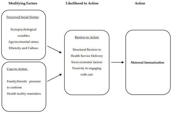Maternal immunisation uptake is greatly influenced by traditional customs and health service delivery challenges. Using a modified HBM model facilitated the highlighting of the impact that normative influences have on people’s perceptions and in turn their actions. These aspects influence the risk perceptions that an individual holds, thus impacting on the decision of whether or not to adhere to an immunisation regime. The strength of cues to action are important as they may have the potential to either positively or negatively influence a pregnant mother to either consider taking the immunisation or refusing to take it up. Understanding health-related behaviours and their influences and addressing barriers that block access can facilitate engagement with care.